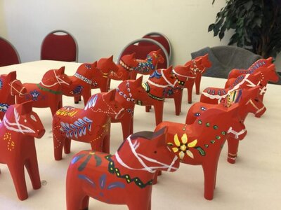 Colorado Corporate Escapes booked a room at SIS and set it up for a fun painting session. We arranged for a Swedish artist to teach the group how to paint the traditional Swedish Dala Horse. Though she was not fluent in English, the artist demonstrated each technique step-by-step so the women could paint these traditional wooden horses. The women were randomly divided into groups where they could easily paint, talk, laugh, and share stories.